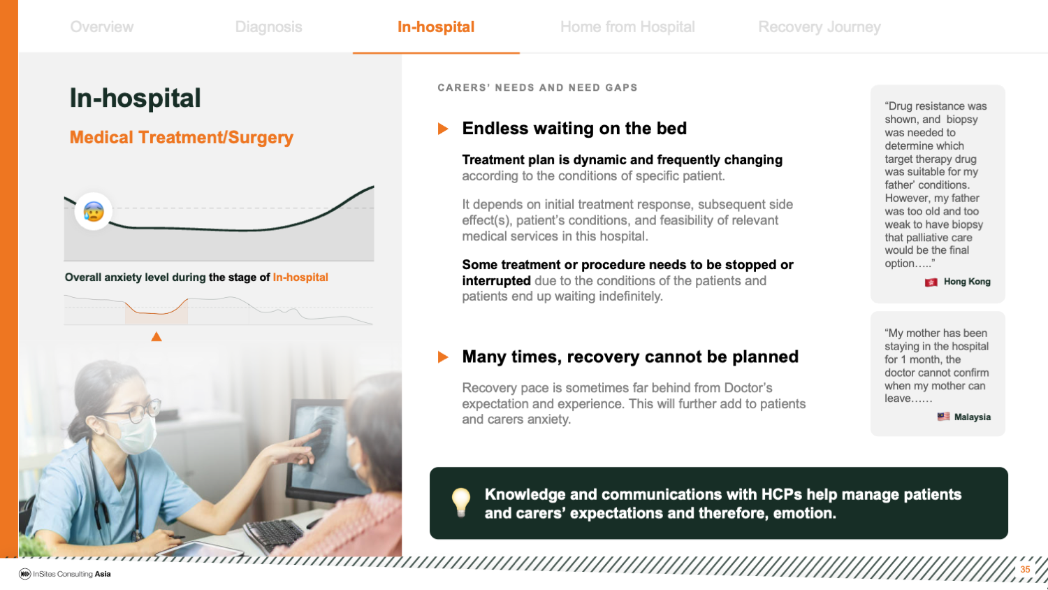Working on the project proposal at the beginning benefits my design process. Since I have developed a good understanding of the research design and objectives, so after the qualitative fieldwork had been completed, I teamed up with the qualitative research team on the “Dirty PowerPoint”. While they focused on distilling complex information and notes from fieldwork, I was exploring other visualization, particularly for the caregivers who participated in the in-depth interviews.